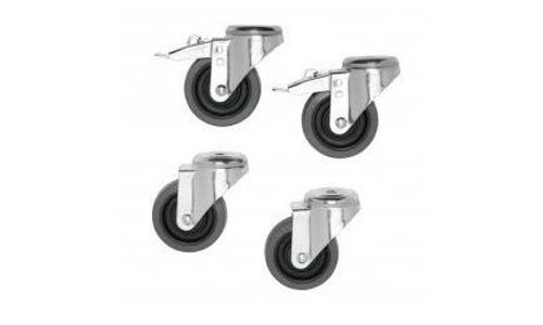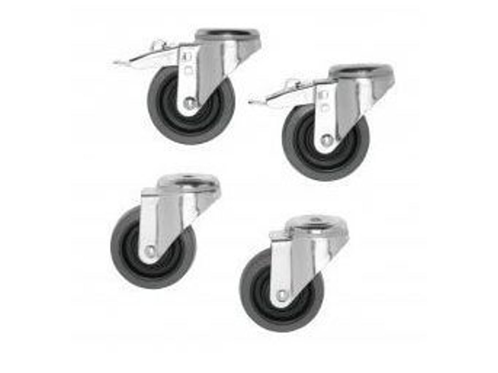 Set van 4 grote zware zwenkwielen. De wielen hebben grijze rubberen banden en stalen lagers voor een betere wendbaarheid op oneffen oppervlakken.
