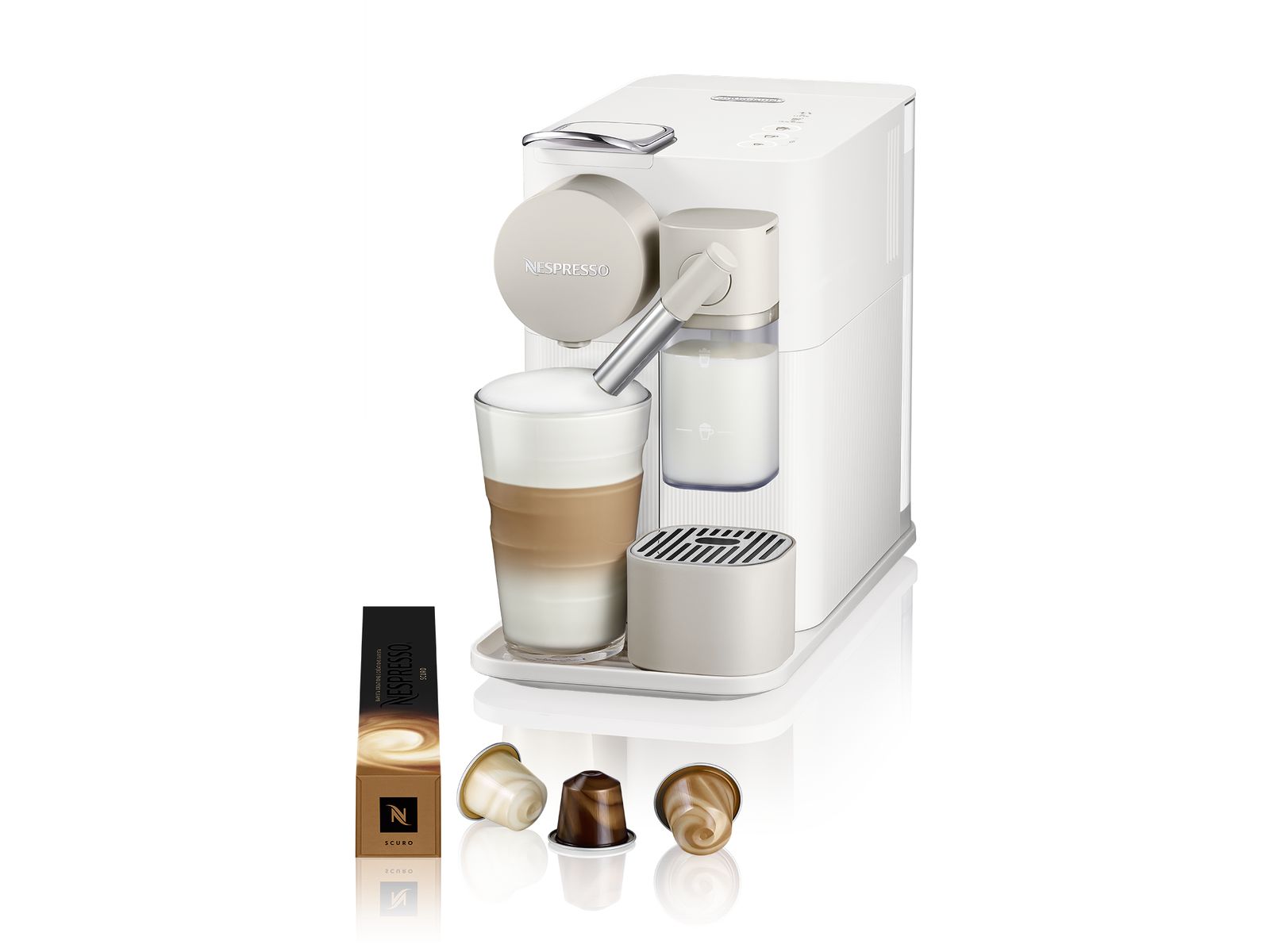Met de Nespresso Lattissima One verwent u zichzelf met een Cappuccino of Latte Macchiato van topkwaliteit in uw eigen huis. Het nieuwe en innovatieve verse melksysteem tilt eenvoud naar een hoger niveau als het gaat om het bereiden van koffie- en melkrecepten of machinereiniging. Deze koffiemachine heeft een compact, hoogwaardig ontwerp en is te bedienen met één druk op de knop. De melkcontainer is vaatwasbestendig.