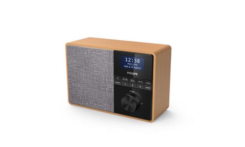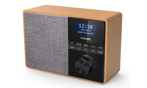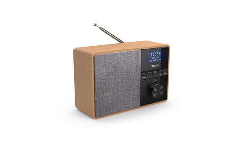 Een lichte, houten behuizing omsluit het zwarte, glanzende display en de luidspreker, die bedekt is met grijze luidsprekerstof. Aan de voorkant van de radio bevinden zich knoppen voor afstemming, bronselectie en meer. Met de slanke draaiknop verhoogt of verlaagt u het volume.