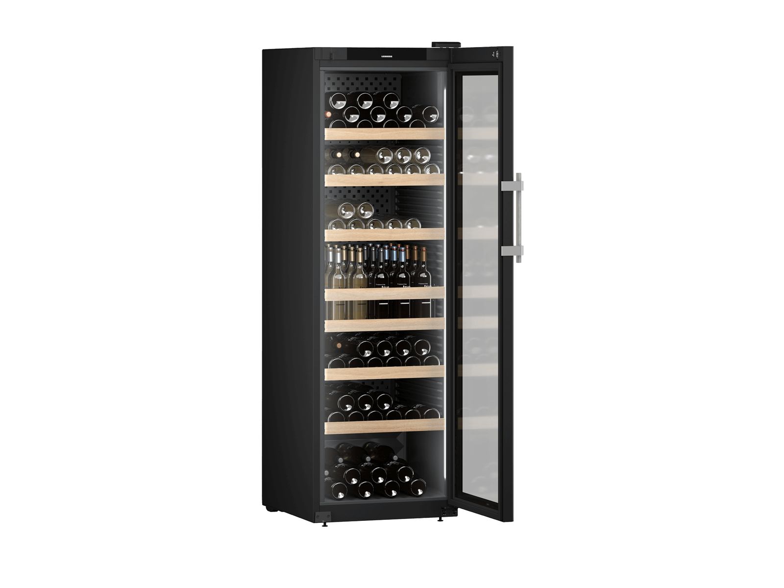 Deze, met Touch&Swipe-scherm uitgeruste, elegante zwarte wijnbewaarkast met eDoorLock systeem beschikt over een stanggreep van geborsteld aluminium met geïntegreerd openingsmechanisme. Door de LightColumn verlichting aan beide zijden en de in hoogste verstelbare metalen draagplateaus met houten front heeft u altijd zicht op uw liggende én de in de EasyServe-flessenmand staande wijnen. Door de PowerChill functie worden nieuw opgeslagen flessen automatisch bijzonder snel afgekoeld. Zelfs wanneer de, met UVProtect Plus uitgeruste, glazen deur voortdurend wordt geopend.