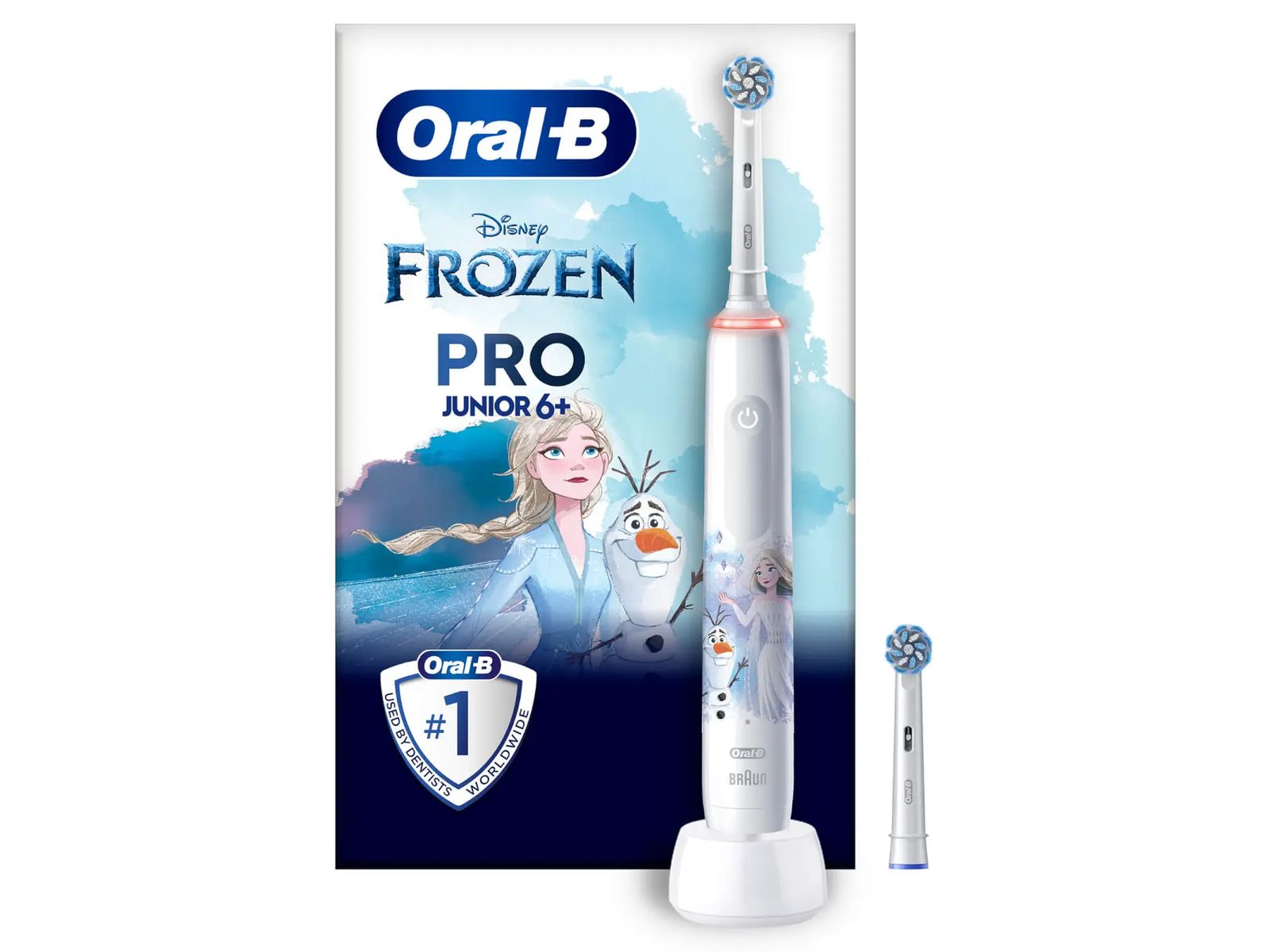 De Oral-B Junior Frozen elektrische tandenborstel voor kinderen vanaf 6 jaar is in samenwerking met tandartsen ontworpen voor een superieure reiniging. Om het gevoelige tandvlees van kinderen te beschermen, heeft de tandenborstel een 360 ? druksensor voor het tandvlees die een rood lampje laat knipperen en de poetssnelheid verlaagt als het detecteert dat er te hard gepoetst wordt. Bovendien heeft de ronde opzetborstel extra zachte borstelharen. Om het poetsen nog leuker te maken, kan hij worden gebruikt met de gratis Disney Magic Timer-app van Oral-B. 90% van de kinderen poetst langer bij gebruik van de app. Dit is dé borstel om kinderen te leren zelfstandig te poetsen en een gezonde poetsgewoonte te ontwikkelen waar ze hun hele leven profijt van hebben.