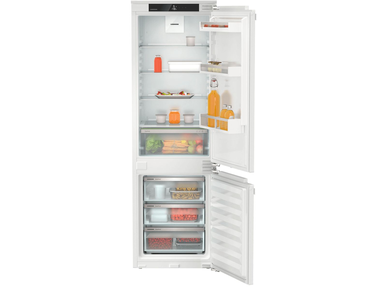 Deze inbouw koel/vriescombinatie uit de Pure-serie voorziet in alle essentiële behoeften. In de EasyFresh lade bewaart u groenten en fruit bij de ideale luchtvochtigheid. Het ruime koeldeel biedt plaats aan een volledige bakplaat en wordt dankzij de LED plafondverlichting goed verlicht. Het FreshAir filter zorgt voor een fris interieur en het SmartFrost vriesdeel kan snel worden ontdooid en biedt plaats aan grote verpakkingen. Geschikt voor smarthome toepassingen dankzij de optionele SmartDeviceBox.