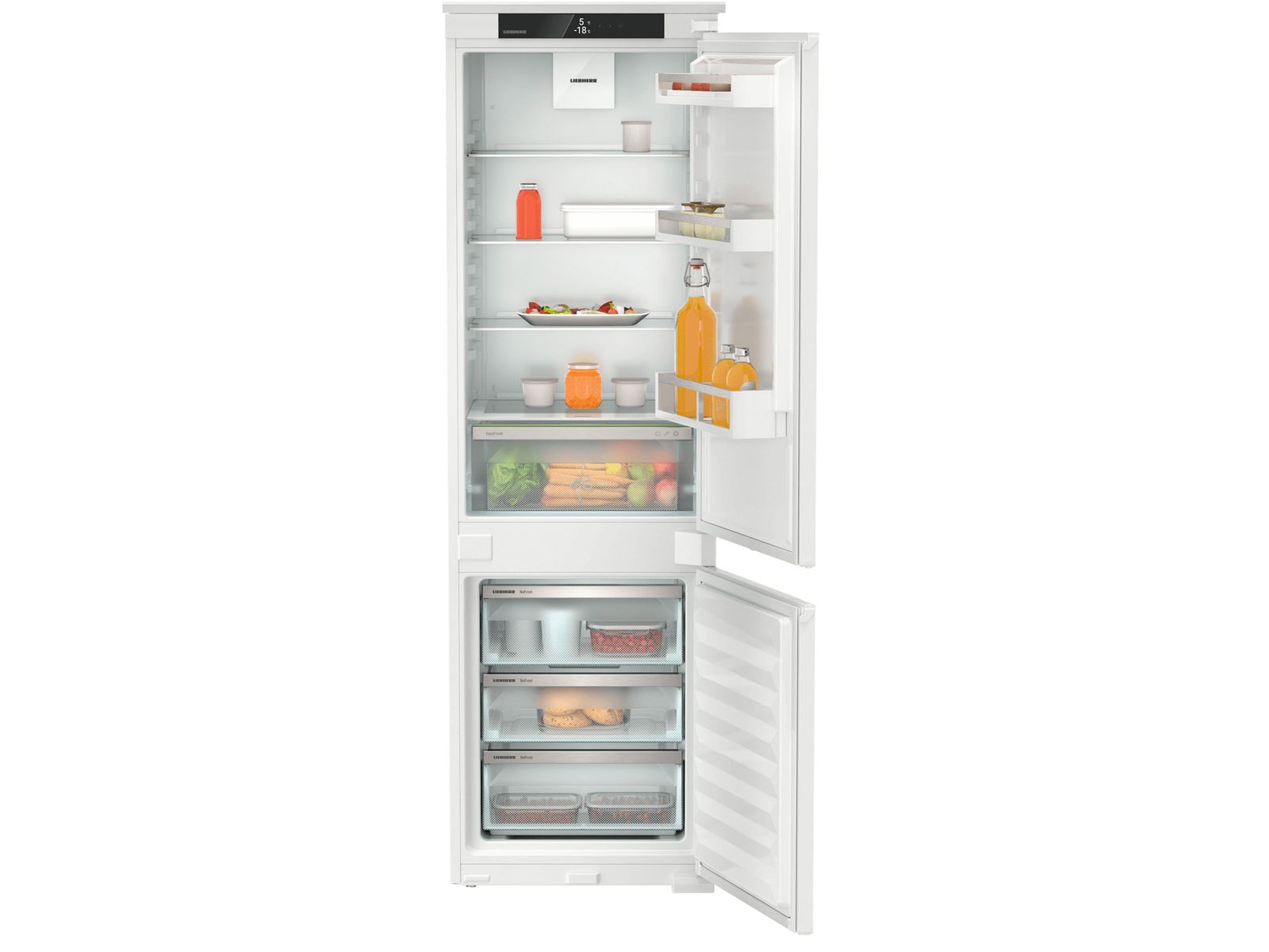 Deze inbouw koel/vriescombinatie uit de Pure-serie voorziet in alle essentiële behoeften. In de EasyFresh lade bewaart u groenten en fruit bij de ideale luchtvochtigheid. Het ruime koeldeel biedt plaats aan een volledige bakplaat en wordt dankzij de LED plafondverlichting goed verlicht. Het FreshAir filter zorgt voor een fris interieur en het NoFrost vriesdeel hoeft nooit te worden ontdooid en biedt ook plaats aan grote verpakkingen. Geschikt voor smarthome toepassingen dankzij optionele SmartDeviceBox.