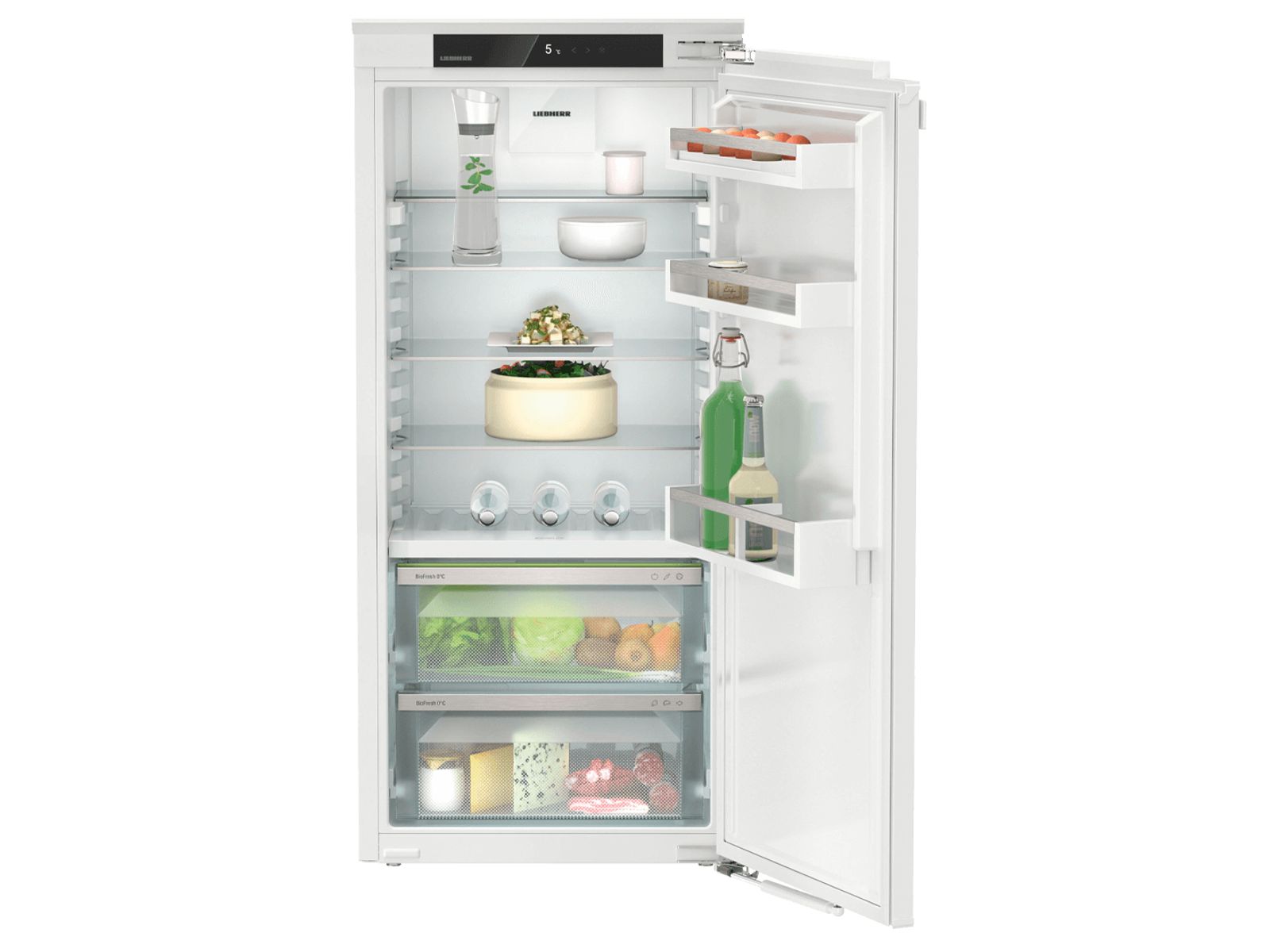 Deze inbouwkoelkast biedt net dat beetje extra. De deur met SoftSystem sluit altijd zacht en volledig. Het deelbare draagplateau en het geïntegreerde flessenplateau bieden extra flexibiliteit. In de 2 BioFresh laden op telescooprails bewaart u groenten en fruit tot 3x langer dan in een normale groentelade. De temperatuur is via het Monochroom display met Touch-bediening instelbaar en toont naast de actuele temperatuur ook alarmmeldingen bij bijv. een stroomstoring. Voorbereid voor smarthome toepassingen.