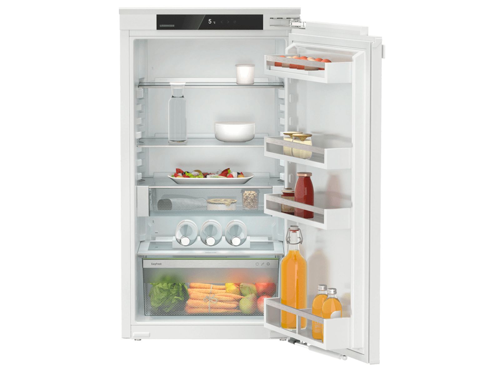Deze inbouwkoelkast biedt net dat beetje extra. De deur met SoftSystem sluit altijd zacht en volledig en de VarioSafe biedt de perfecte opbergplek voor kleine potjes en verpakkingen. Het deelbare draagplateau biedt extra flexibiliteit. In de EasyFresh lade bewaart u groenten en fruit bij de ideale luchtvochtigheid zodat smaak en structuur behouden blijven. De temperatuur is via het Monochroom display met Touch-bediening instelbaar en toont de actuele temperatuur. Voorbereid voor smarthome toepassingen.