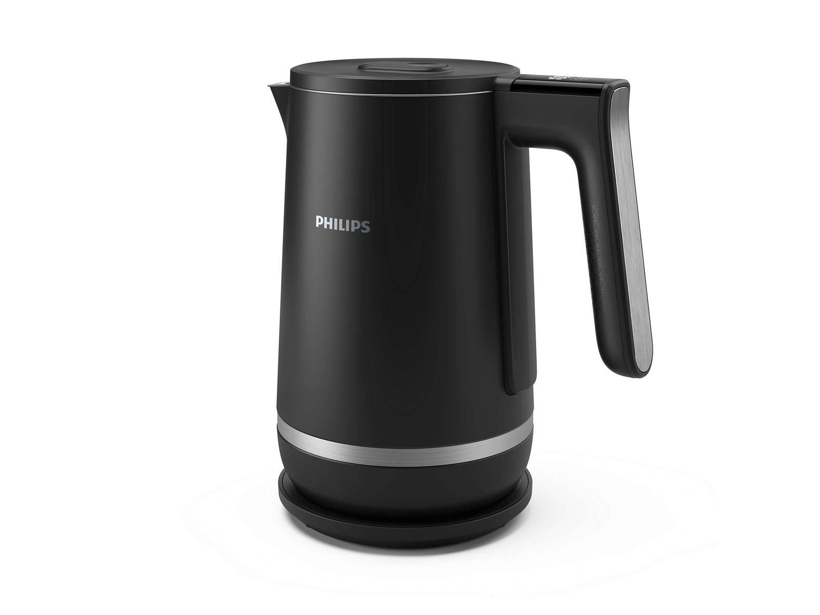 U hoeft niet te wachten tot de buitenkant van uw waterkoker is afgekoeld. Onze waterkoker met temperatuurregeling heeft een dubbele isolatielaag die zorgt voor een constante koele buitenkant, terwijl de waterwarmte binnenin langer behouden blijft.