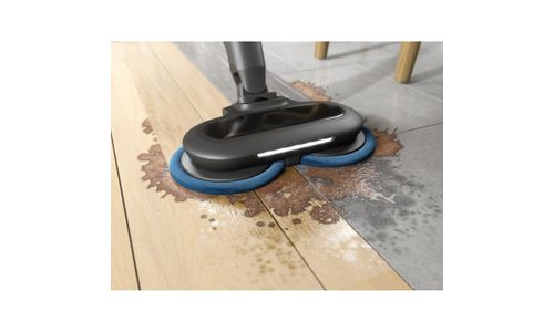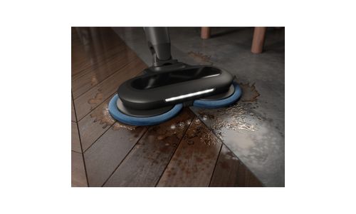 De dweilmond is voorzien van roterende reinigingspads die vuil van harde vloeren verwijderen, waardoor een frisse en glanzende afwerking ontstaat.