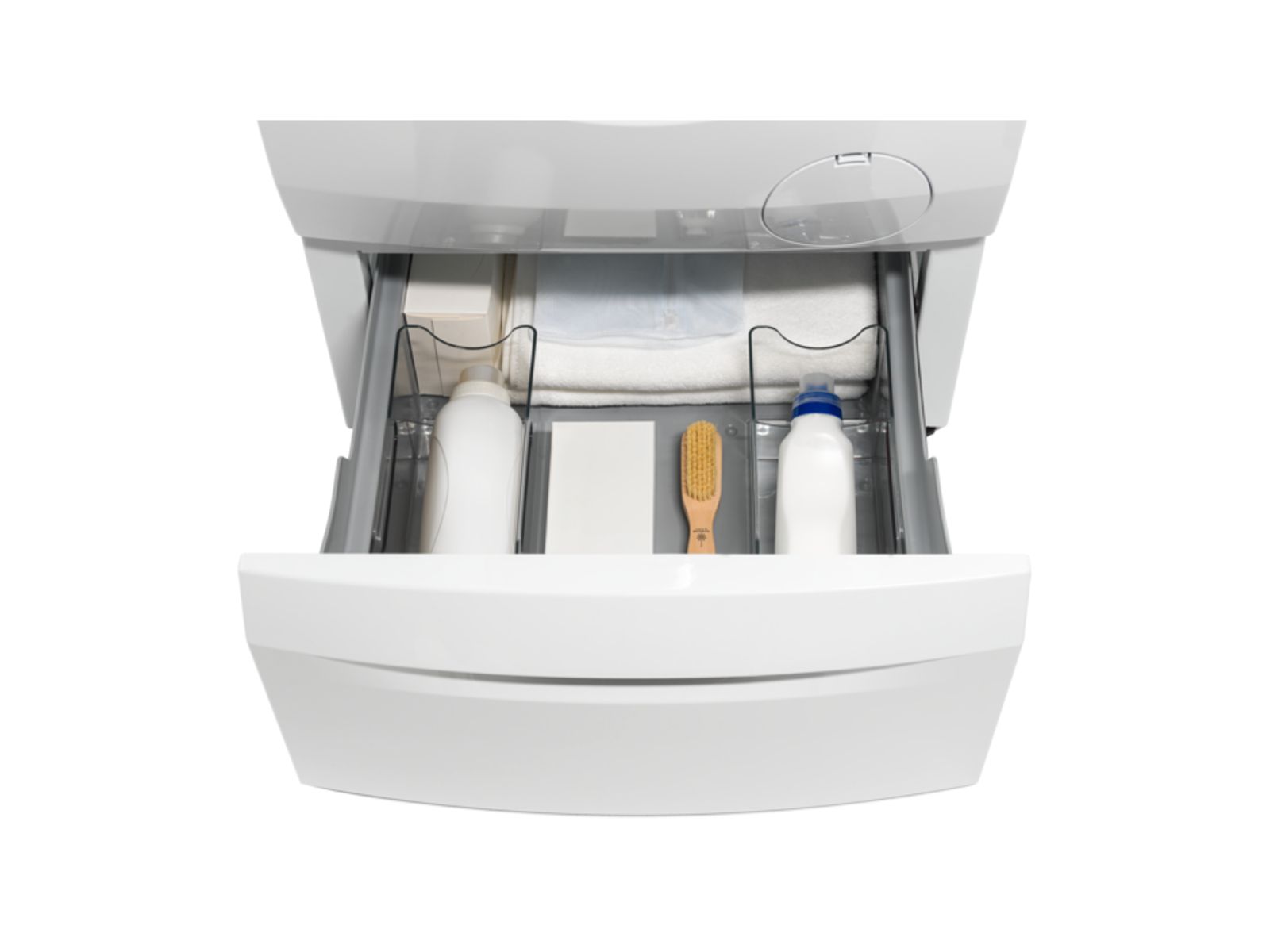 Het voetstuk vormt een platform voor je machines en de lades hebben vakken om je te helpen bij het opbergen van wasmiddelen en accessoires. Het resultaat is een beter georganiseerde waservaring.