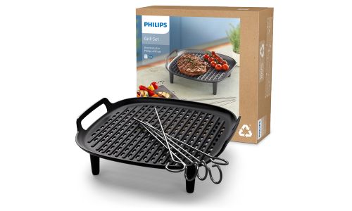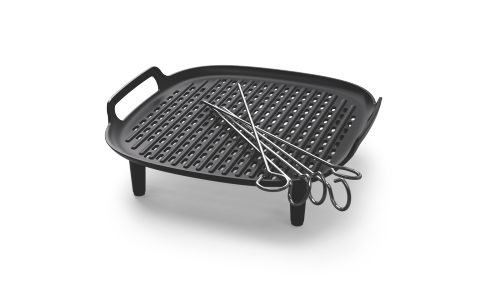 Plaats uw favoriete gerechten zoals hamburgers, groenten en kippendrumsticks boven en onder de grillplaat om de ruimte van uw airfryer optimaal te benutten.