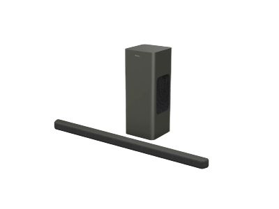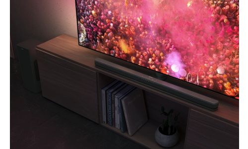 2.1 kanelen en meeslepende audiotechnologie tillen uw geluidsbeleving naar een hoger niveau, terwijl de ultracompacte draadloze subwoofer effecten en muziek extra gewicht geeft. Met de vier EQ-modi kunt u een geluidsstijl kiezen die past bij wat u kijkt. Stemmen worden in elke modus helderder als u stemversterking activeert.