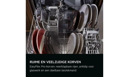 De vernieuwde EasyFlex Plus-korven glijden soepel en hebben drie opklapbare rijen voor moeilijk plaatsbare items. Rubberen houders en antislip-noppen houden glaswerk stevig op zijn plaats. Het bestekmandje is deelbaar voor flexibele indeling.